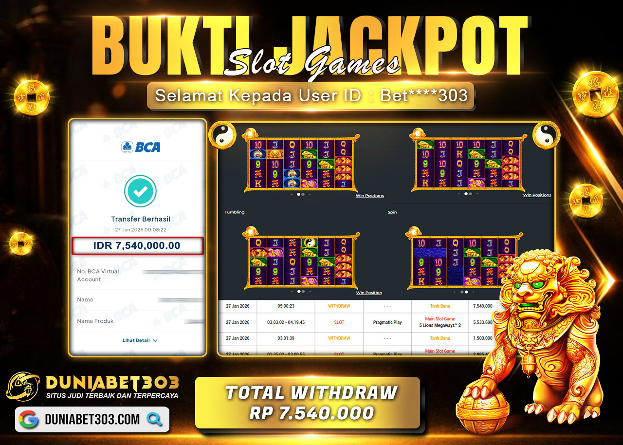 Gambar ini memperlihatkan hasil asli member Duniabet303 saat bermain 5 Lions Megaways dari Pragmatic Play. Proses penarikan dana tercatat jelas dengan nominal jutaan rupiah, saldo masuk penuh ke rekening, serta transaksi berjalan lancar tanpa kendala. Data ini menunjukkan sistem pembayaran yang aman dan transparan.